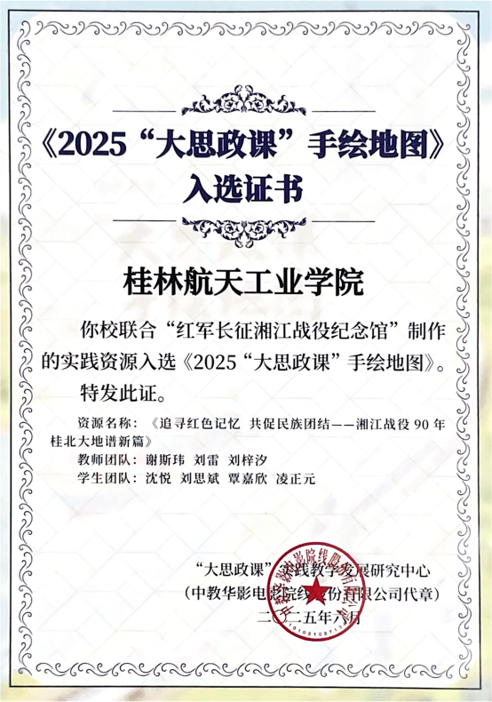 近日,由乐竞官网师生联合“红军长征湘江战役纪念馆”共同完成的作品《追寻红色记忆 共促民族团结——湘江战役90年桂北大地谱新篇》成功入选教育部《2025“大思政课”手绘地图》。“大思政课”实践教学发...