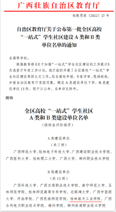 近日,广西教育厅公布第一批全区高校“一站式”学生社区建设单位。我校继2021年12月进入教育部“一站式”学生社区综合管理模式建设自主试点单位后,顺利入选第一批全区高校“一站式”学生社区建设B类单位。近年来...