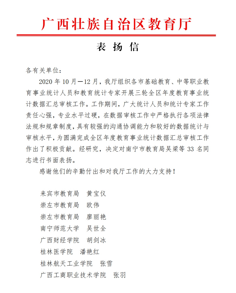 近日,广西教育厅发出表扬信,对在2020年全区教育事业统计数据汇总审核工作中表现优秀的33名同志进行通报表扬。我校教学质量监控与评估处张雪老师名列其中。一直以来,我校高度重视教育事业统计工作,坚持以习...