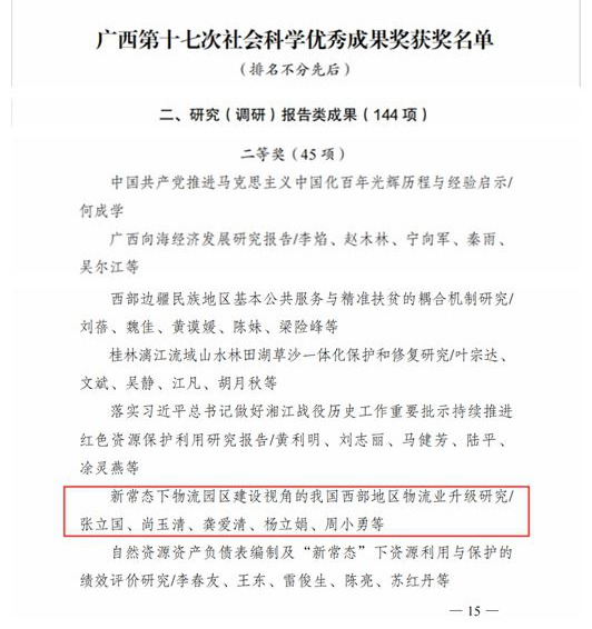 自治区人民政府日前发布了广西第十七次社会科学优秀成果奖获奖名单,我校张立国教授团队申报的研究成果《新常态下物流园区建设视角的我国西部地区物流业升级研究》获研究(调研)报告类成果二等奖。这是我校首次...