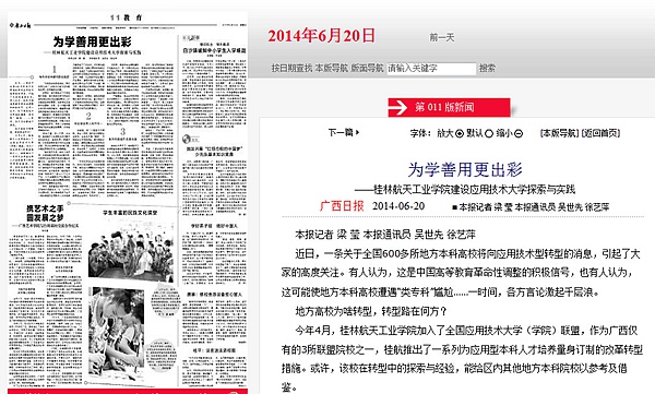 2014-06《广西日报》教育版头条报道我校建设应用技术大学探索与实践