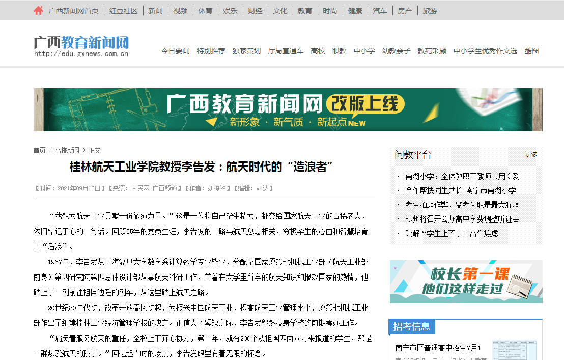 2021-10【广西新闻网】乐竞官网教授李告发:航天时代的“造...
