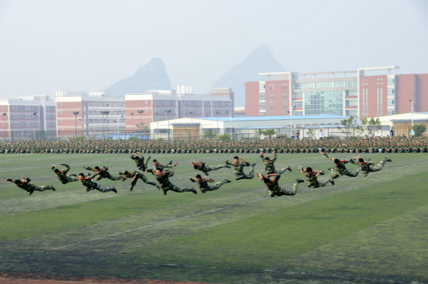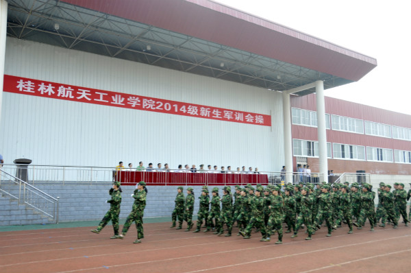 10月18日上午,我校2014级新生军训会操在南校区运动场隆重举行。党委书记李幼平、副院长詹皖生、武警桂林支队副参谋长俞德海出席了军训会操,学校各职能部门负责人及各系党总支副书记观看了会操。会操中,全校49个方队接受了检阅,受阅方队在阅兵指挥官的指挥下依次通过主席台,他们步伐整齐、口号嘹亮、军姿飒爽,展现了2014级新生朝气蓬勃、奋发向上的精神风貌,赢得了领导和师生们的阵阵掌声。检阅结束后,还进行了男子擒敌拳、女子花样方块操和教官擒敌术的精彩表演,整个会场爆发出阵阵喝彩和掌声。