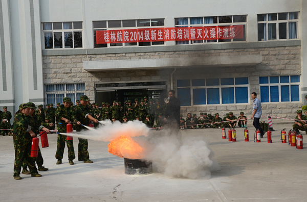 为增强我校新生的消防安全意识,10月15日下午,我校2014级新生消防知识培训暨灭火操作演练分别在北校区一号教学楼后广场和南校区兵乓球馆前举行,3600余名新生参加了此次演练。