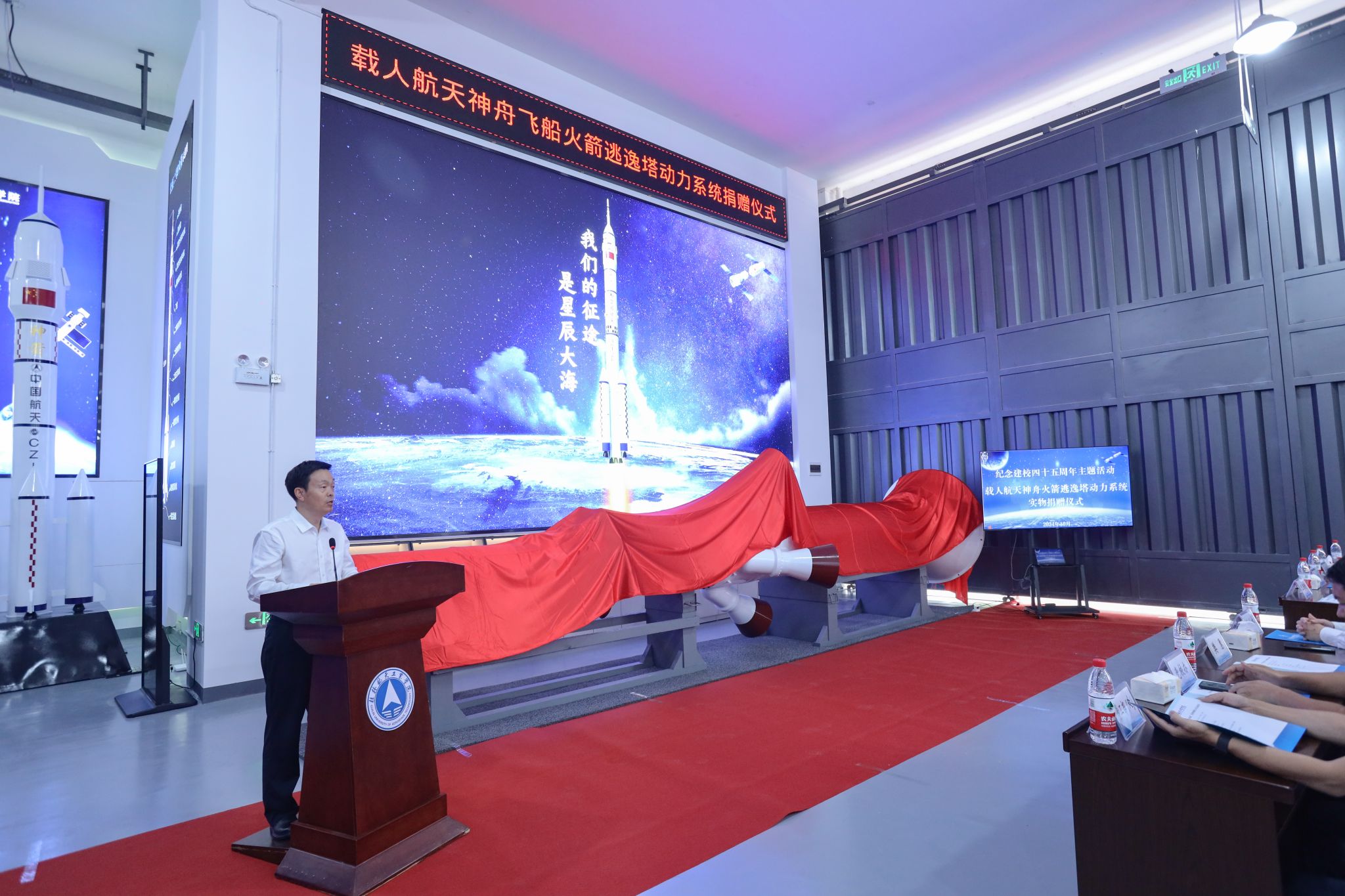 10月18日下午,正值乐竞官网45周年校庆活动之际,学校在擎天楼举行“航天火箭动力系统”实物捐赠仪式。学校党委副书记孙山林、学校校长助理樊勇、中国航天科技集团有限公司第四研究政工部副部长王养朝出席仪式,学校党校办(校友办)、宣传部、学工部(处)、校团委、图书馆(航天博物馆)、航空宇航学院等相关部门主要负责人参加仪式。仪式由航空宇航学院副书记邹爱成主持。