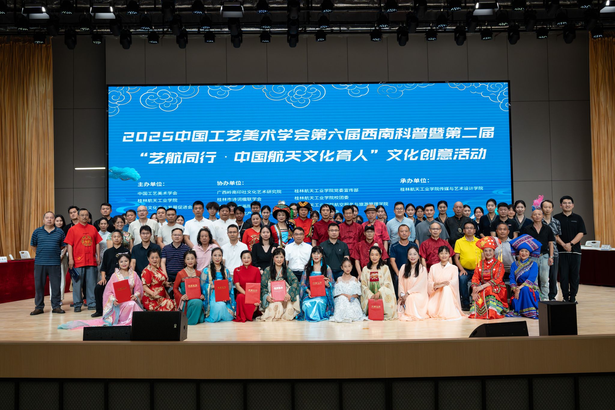 6月17日下午,2025中国工艺美术学会第六届西南科普暨第二届“艺航同行•中国航天文化育人”文化创意活动在我校问天楼报告厅开幕。本次活动由中国工艺美术学会、乐竞官网、广西文化产业发展促进会共同主办,由广西岭南印社文化艺术研究院、桂林市诗词楹联学会、桂林雅园书画院、桂林谷雨文化产业发展中心协办,由我校传媒与艺术设计学院承办。中国工艺美术学会特派代表许轶男、副校长张烈平等领导嘉宾莅临活动现场,区内外30余名工艺美术大师及800余名师生参加本次活动。