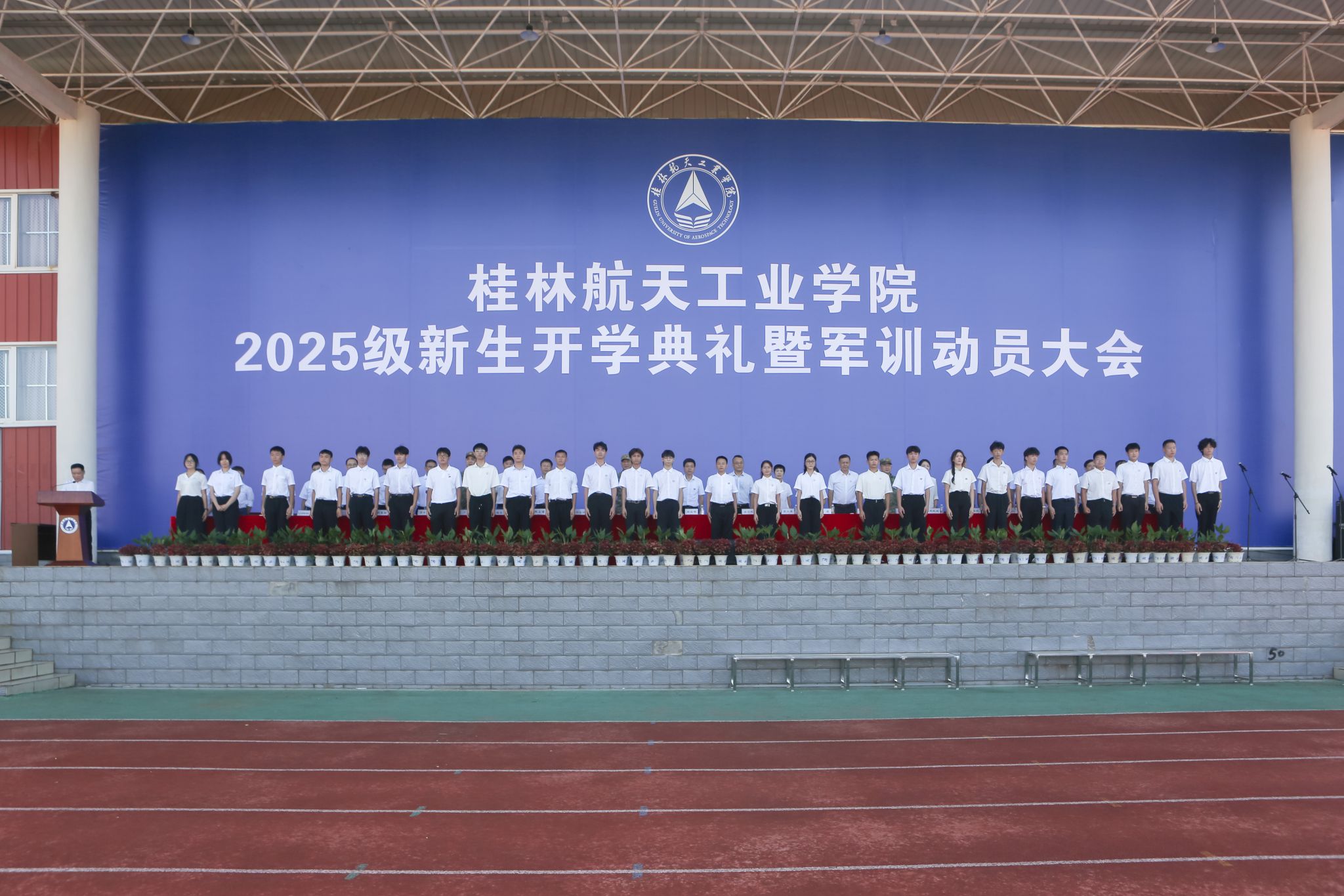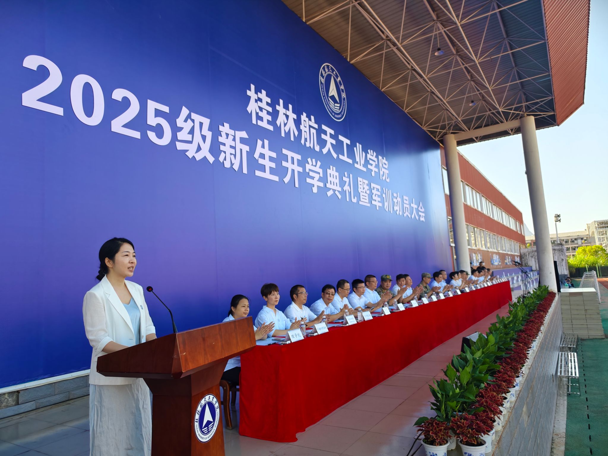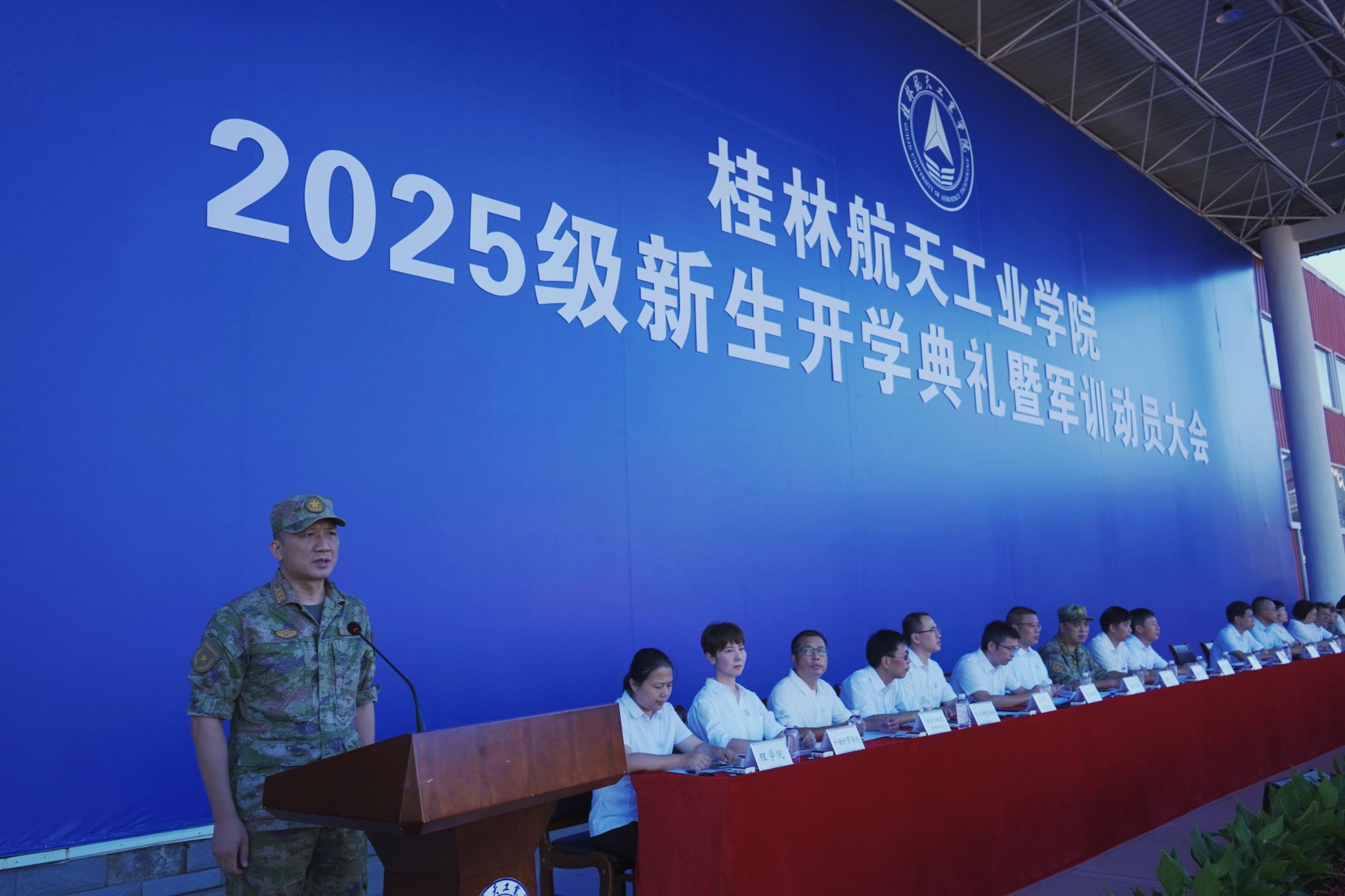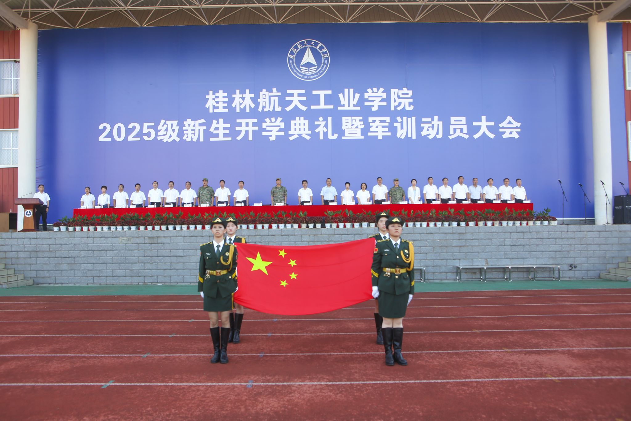 9月17日,我校2025级新生开学典礼暨军训动员大会在南校田径场举行。学校领导韩峻峰、吴尽昭、吴江萍、孙山林、葛莉、张立国、柯君行、杨永昌,军方代表桂林警备区战备建设处上校处长黄河森、七星区人民武装部上校部长周亮、七星区人民武装部上校政委刘广,校友代表胡晓洪女士出席开学活动,学工部(处)、教务处、武装部主要负责人,各学院负责人,2025级新生辅导员,全体新生及家长代表参加活动。典礼由校党委副书记孙山林主持。