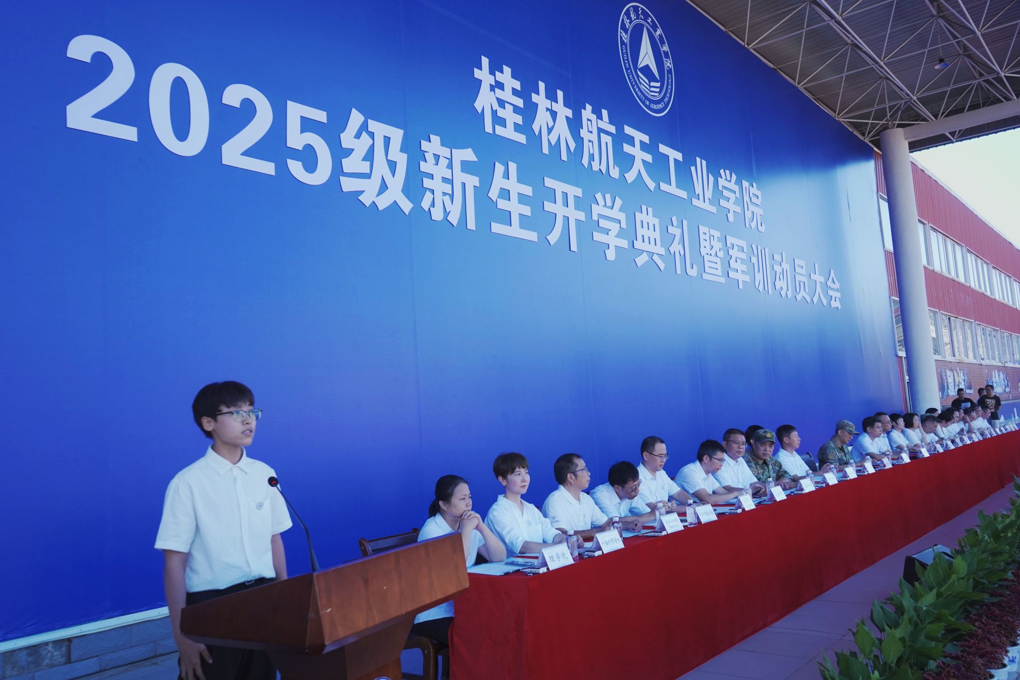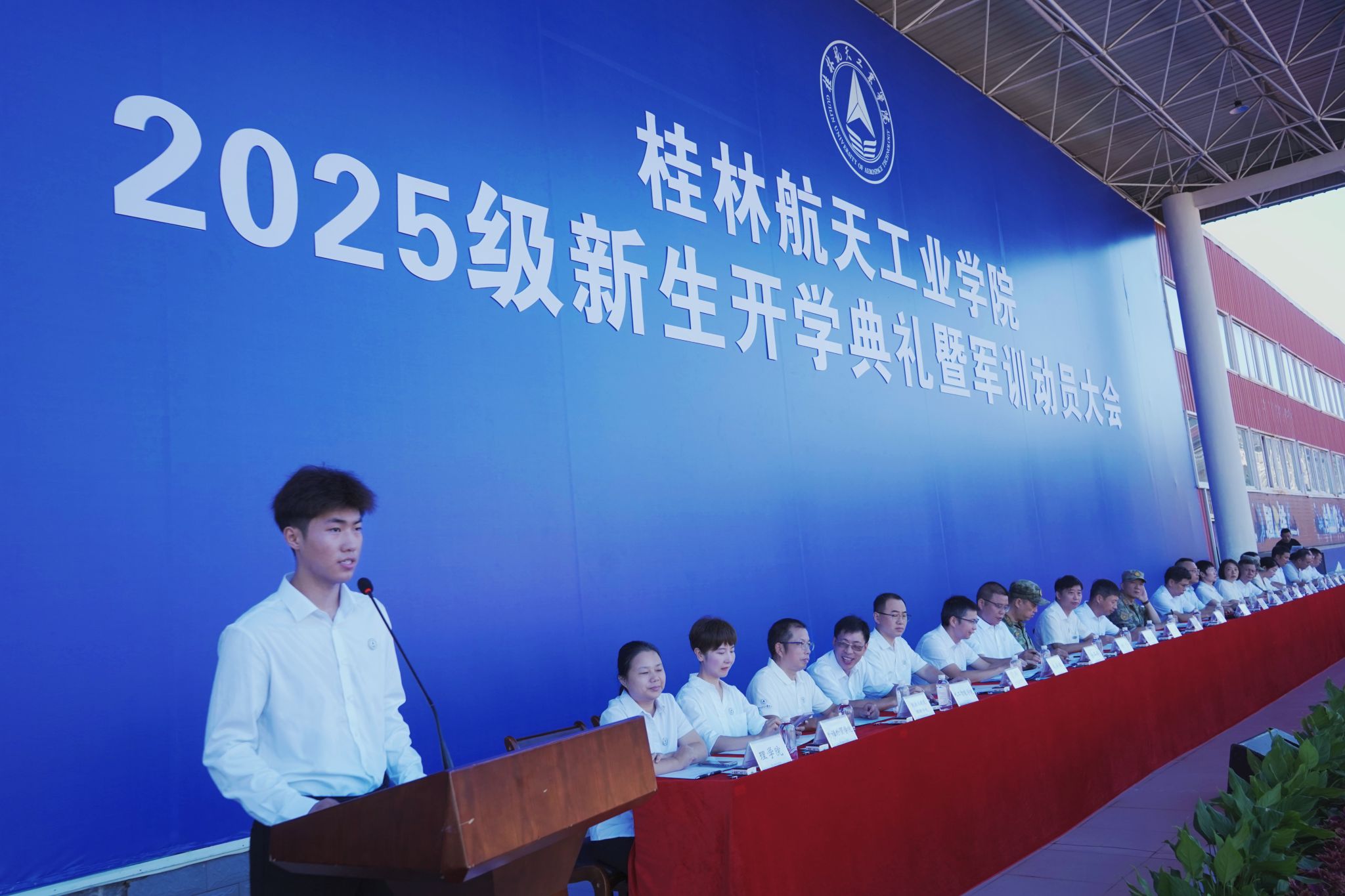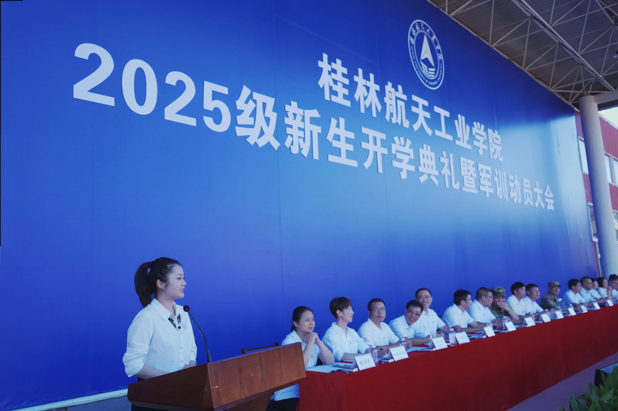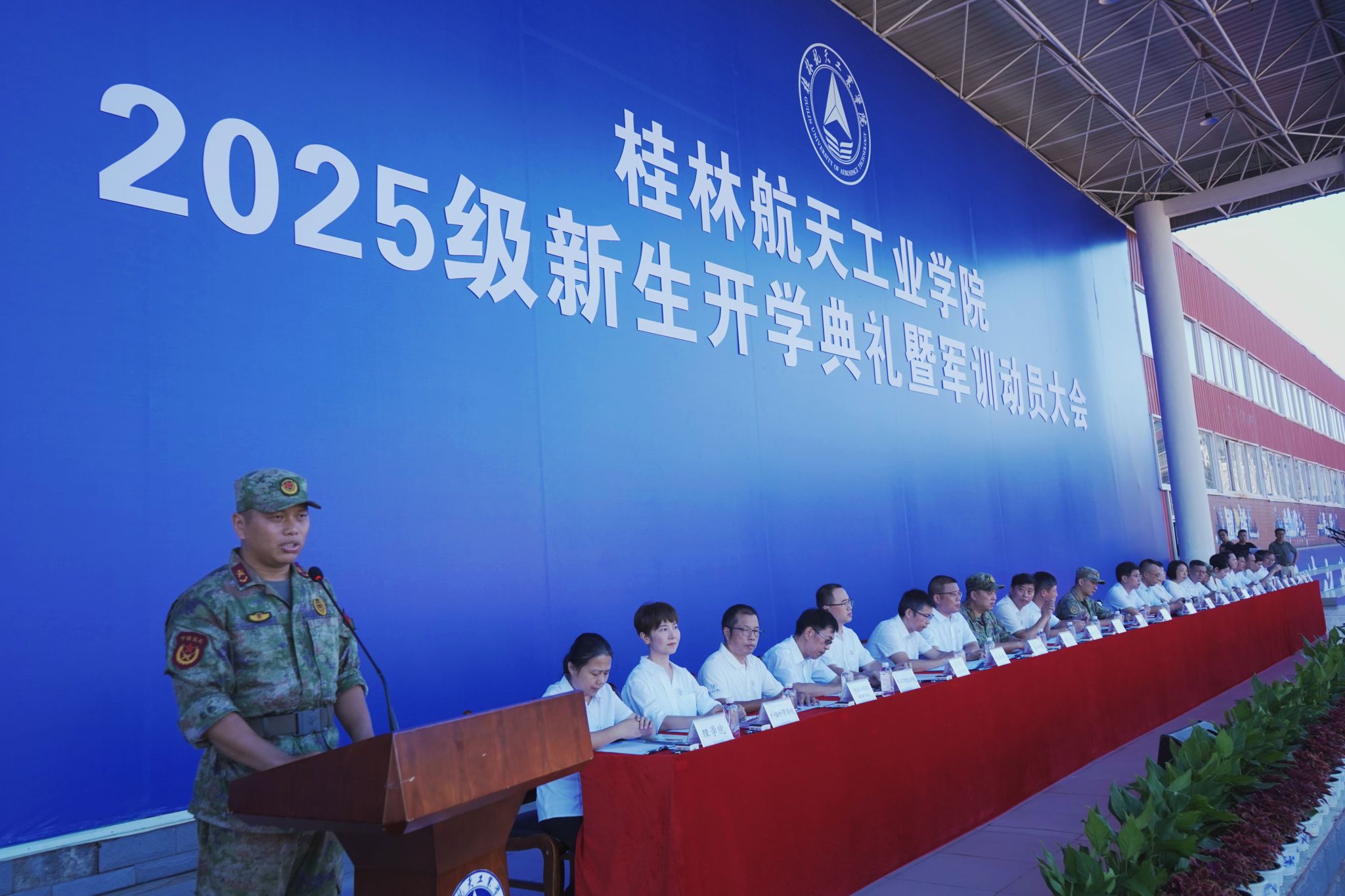 9月17日,我校2025级新生开学典礼暨军训动员大会在南校田径场举行。学校领导韩峻峰、吴尽昭、吴江萍、孙山林、葛莉、张立国、柯君行、杨永昌,军方代表桂林警备区战备建设处上校处长黄河森、七星区人民武装部上校部长周亮、七星区人民武装部上校政委刘广,校友代表胡晓洪女士出席开学活动,学工部(处)、教务处、武装部主要负责人,各学院负责人,2025级新生辅导员,全体新生及家长代表参加活动。典礼由校党委副书记孙山林主持。