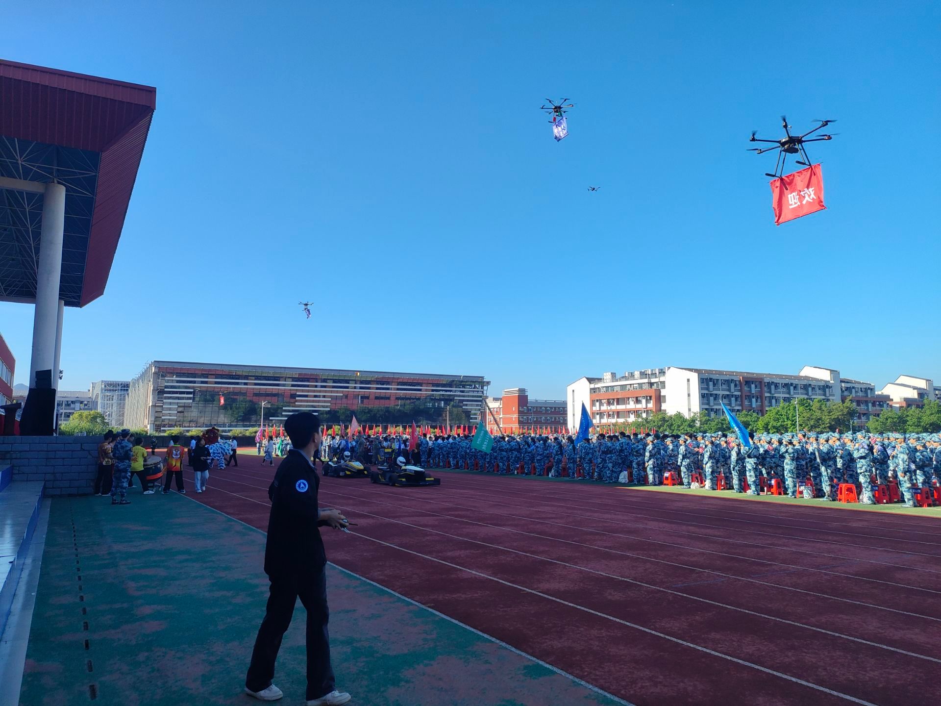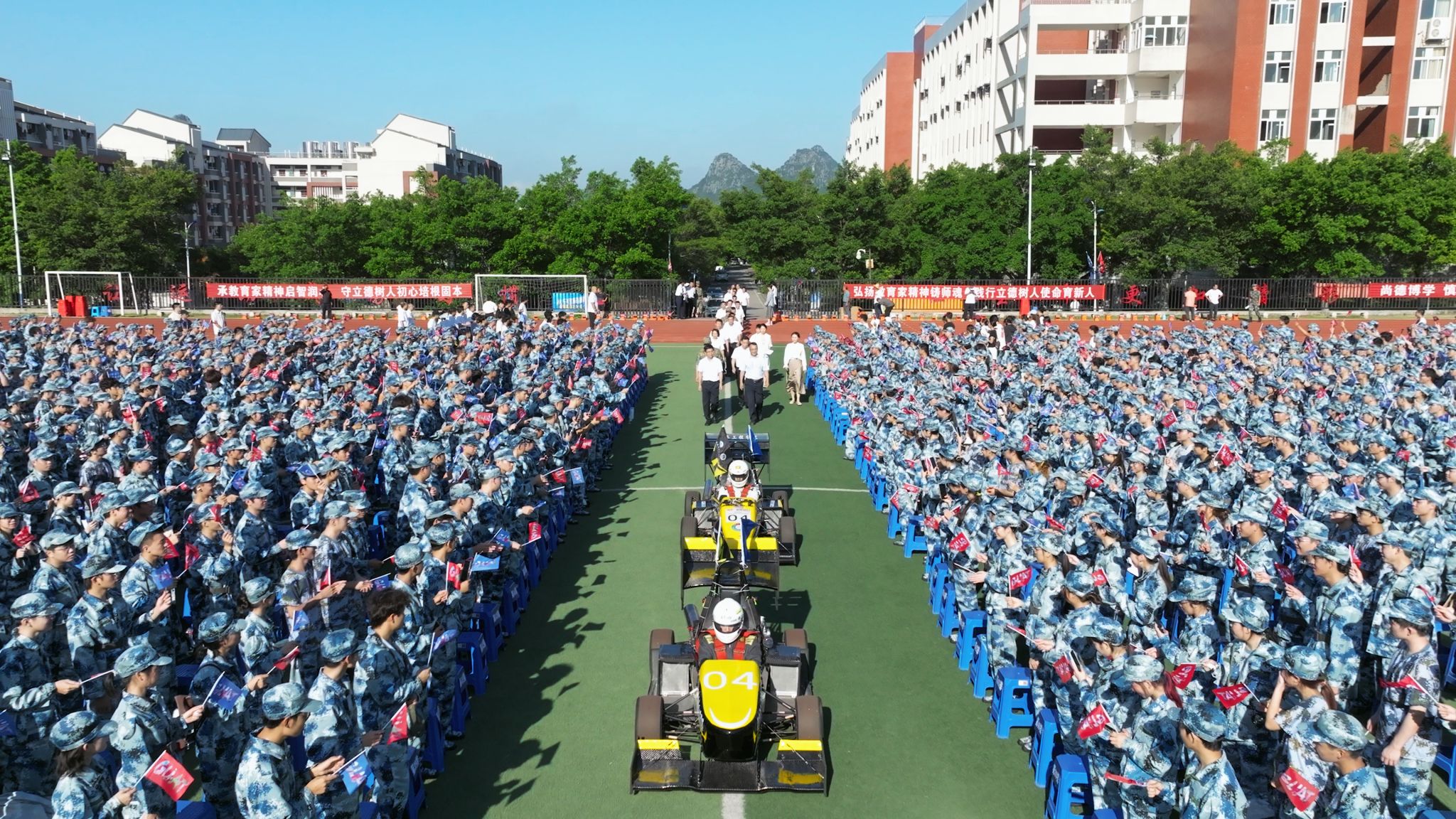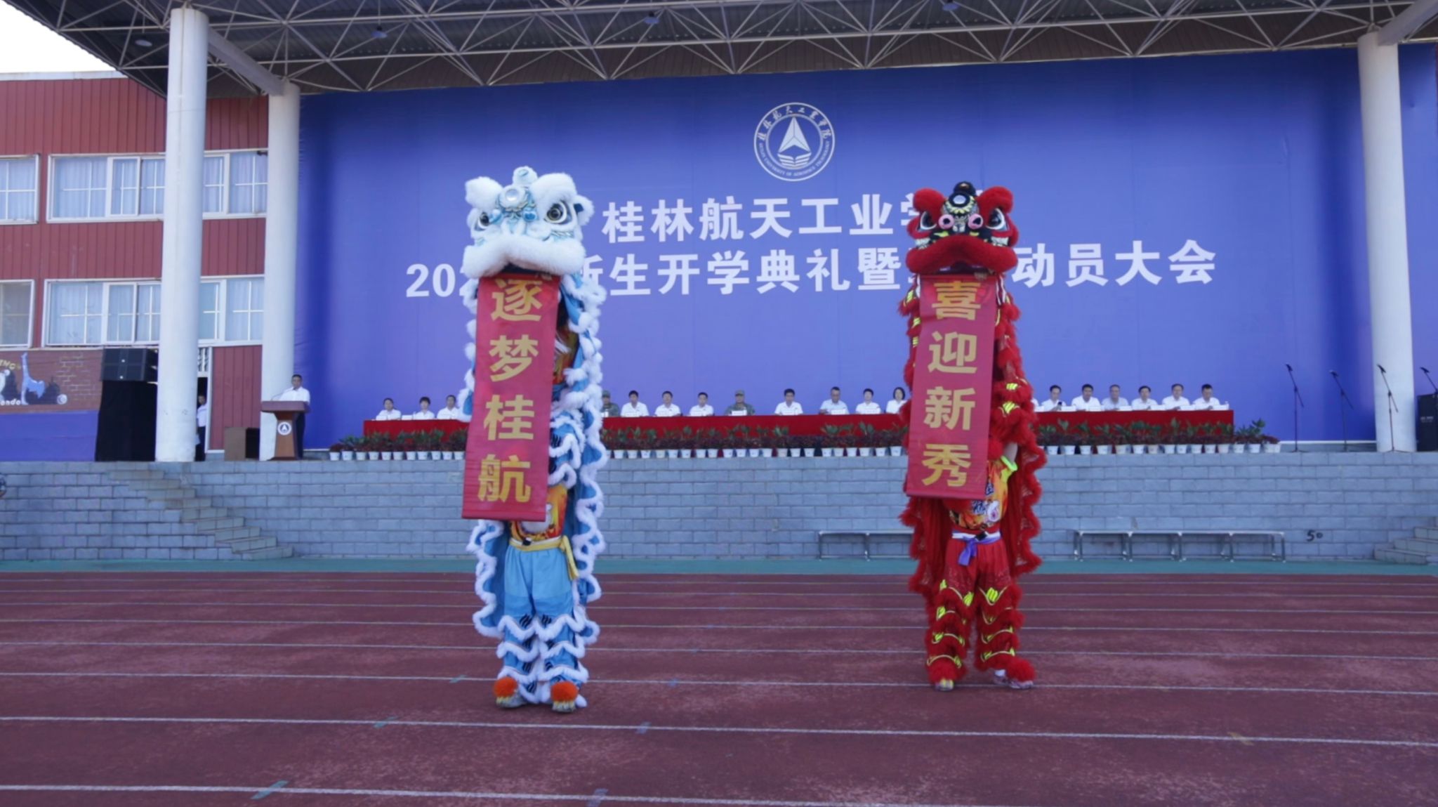 典礼开始前,学校特别设计了暖场环节,刚刚获得俄罗斯大学生方程式汽车大赛总冠军的航V车队载誉行驶在田径场上;舞狮队以精彩的舞狮表演向新生们送出“喜迎新秀、逐梦桂航”祝福;为新生空投通知书的广西高校无人机遥测重点实验室团队,启用多种型号无人机打出“欢迎桂航萌新”的口号,展示校旗、校训,激发了新生爱校、荣校的情怀,拉开了大学新征程的热烈序幕。