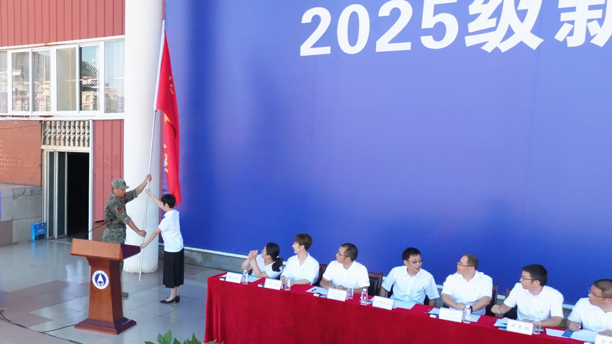 学校党委副书记吴江萍同志为2025级新生军训团授旗,总教官代表军训团接旗。