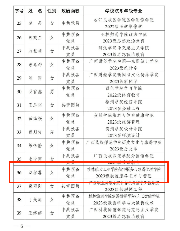 近日,2025年广西青年马克思主义者培养工程高校班入选名单公布,航空服务与旅游管理学院学生第二党支部预备党员、2023级航空服务艺术与管理专业刘桂菲,凭借扎实的政治理论学习,积极投身社会实践与校园建设的经历,从众多学生骨干中崭露头角成功入选。为我校入选此次“青马工程”高校班唯一学员,也是自2022年以来该支部再次有学生党员入选。