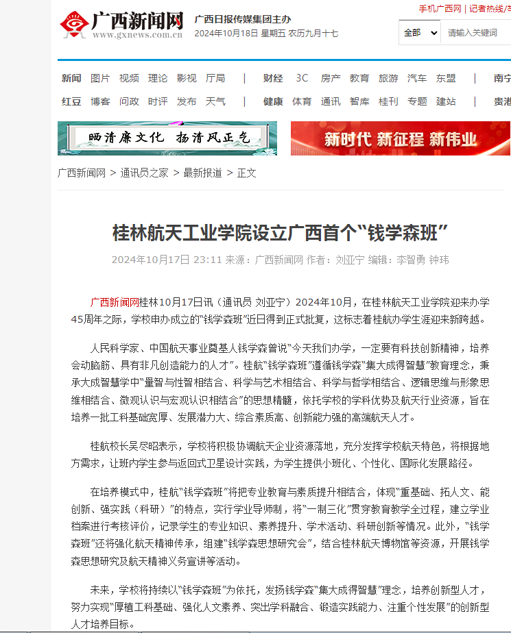 在培养模式中,“钱学森班”将把专业教育与素质提升相结合,体现“重基础、拓人文、能创新、强实践(科研)”的特点,实行学业导师制,将“一制三化”贯穿教育教学全过程,建立学业档案进行考核评价,记录学生的专业知识、素养提升、学术活动、科研创新等情况。此外,“钱学森班”还将强化航天精神传承,组建“钱学森思想研究会”,结合桂林航天博物馆等资源,开展钱学森思想研究及航天精神义务宣讲等活动。