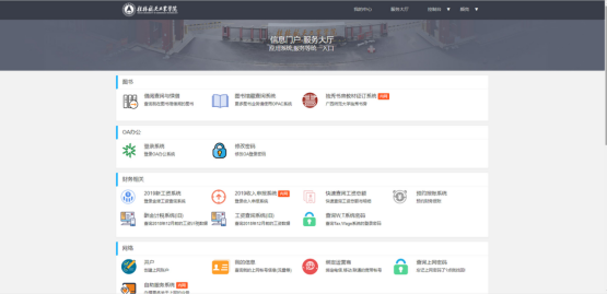 信息门户平台是一个面向全校师生的个性化应用集成和信息整合平台,它将学校的多项服务功能和数据集成到一个信息管理平台,统一展示给全体用户,目的是构建一站式服务平台,为师生访问数字校园应用系统等服务提供方便快捷的统一入口。