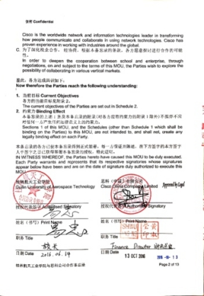 图10 与思科公司合作建设“思科-桂航物联网产教融合协同育人基地”签订的合作备忘录