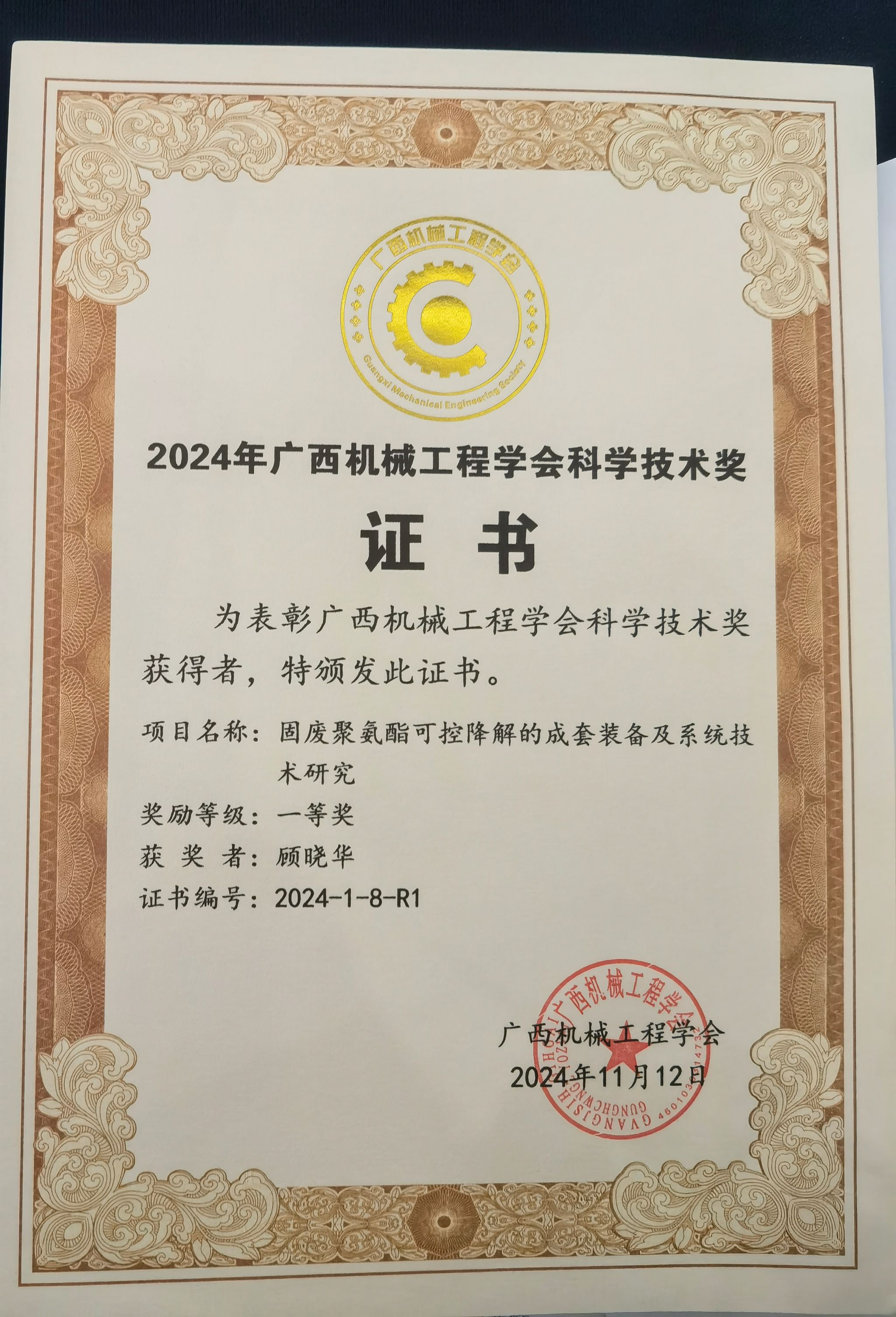 近日,广西机械工程学会年度科学技术奖颁奖典礼在南宁隆重举行。此次颁奖典礼汇聚了区内外的机械工程领域顶尖专家与学者,能源与建筑环境学院教授顾晓华凭借其在“固废聚氨酯可控降解的成套装备及系统技术研究”领域的突出贡献,荣获2024年广西机械工程学会科学技术奖一等奖,这是我校第二次获得此项荣誉。