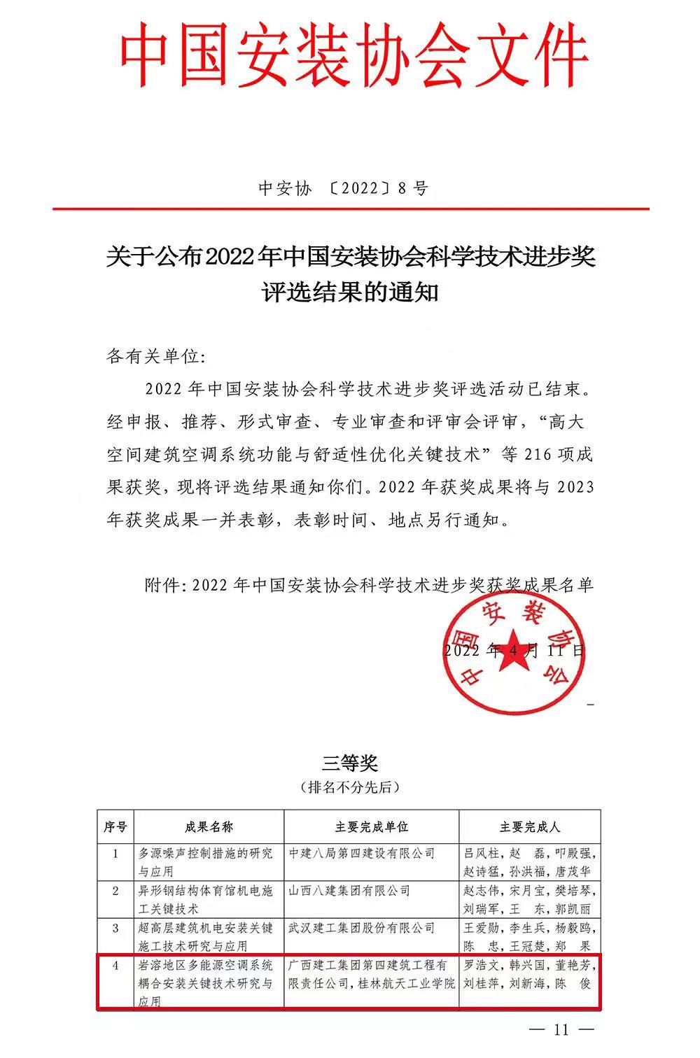 近日,2022年中国安装协会科学技术进步奖公布评选结果,我校能源与建筑环境学院教师韩兴国、董艳芳与广西建工集团第四建筑工程有限责任公司联合申报的科研成果《岩溶地区多能源空调系统耦合安装关键技术研究与应用》从全国入选的406项实际工程应用成果中脱颖而出,获得三等奖。