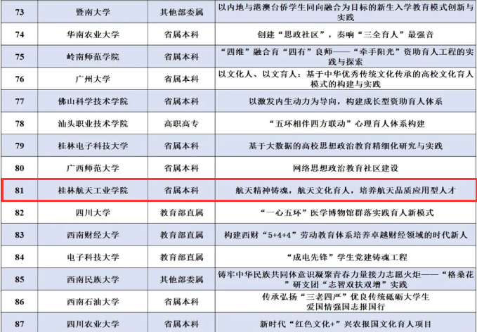日前,教育部思想政治工作司公布了2021年高校思想政治工作有关培育建设项目的入选名单,由我校党委书记李幼平主持的文化育人项目《航天精神铸魂,航天文化育人,培养航天品质应用型人才》入选2021年高校思想政治工作精品项目。这是教育部自2018年设立该培育建设项目以来,我校第一次入选,是我校学生思想政治工作的重要突破,充分彰显了学校实施思想政治工作质量提升工程、构建“三全育人”良好育人格局的积极成效。