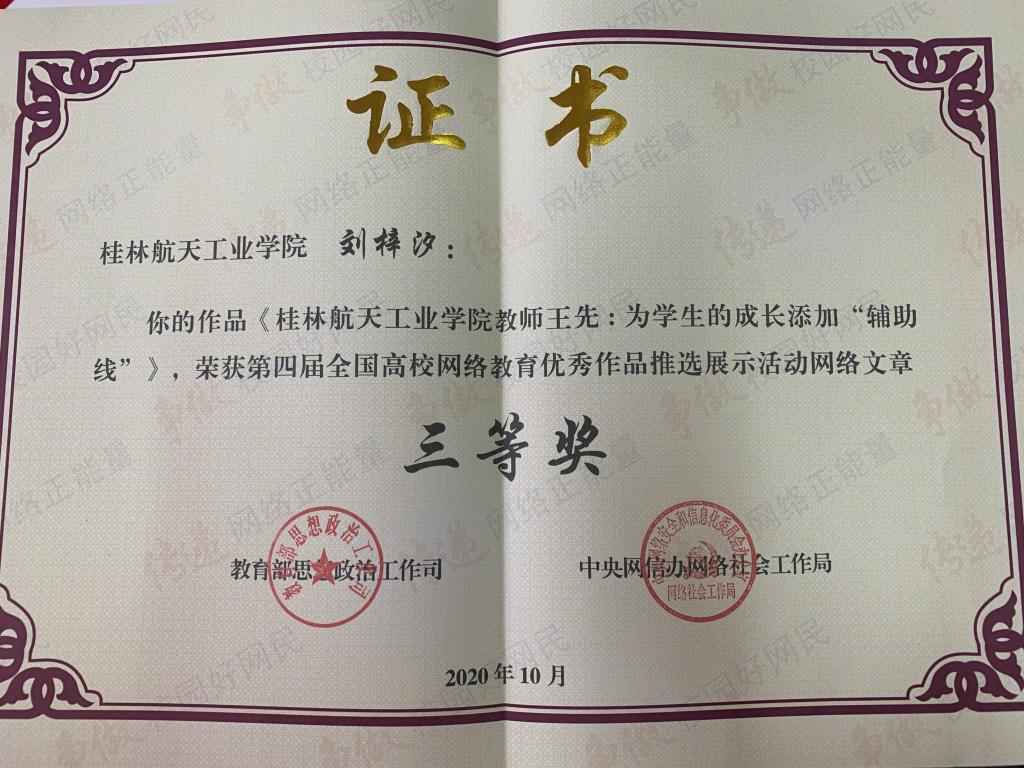 日前,由教育部思想政治工作司、中央网信办网络社会工作局联合举办的第四届全国高校网络教育优秀作品推选展示活动获奖作品名单揭晓。我校选送的作品《乐竞官网教师王先:为学生的成长添加“辅助线”》获全国三等奖,是本组别中广西获得的最高奖项,学校获得优秀组织奖,实现了我校在该项活动中的新突破。