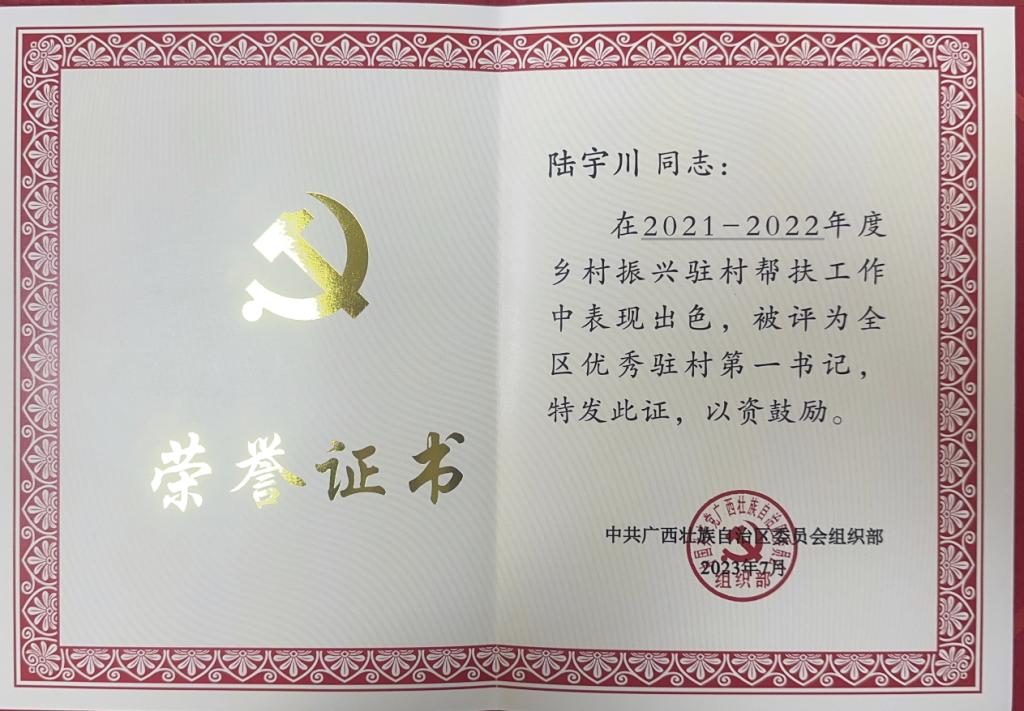 近日,自治区党委组织部印发了《关于表彰全区2021—2022年度驻村工作队先进集体和优秀个人的决定》(桂组发〔2023〕5号),对全区2021—2022年度10个乡村振兴驻村帮扶先进工作队、100个先进后盾单位、10名优秀县级工作队队长、199名优秀驻村第一书记以及300名优秀驻村工作队员进行了表彰。我校原派驻灌阳县新圩镇潮立村党组织第一书记陆宇川同志获得“全区优秀驻村第一书记”称号。