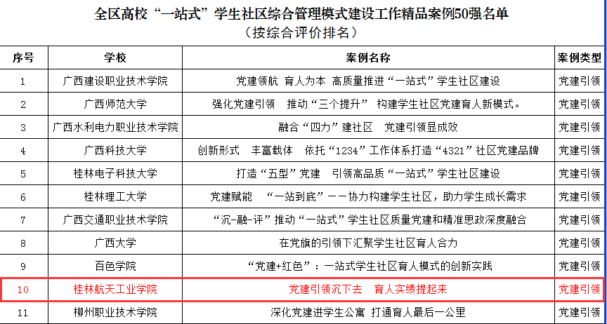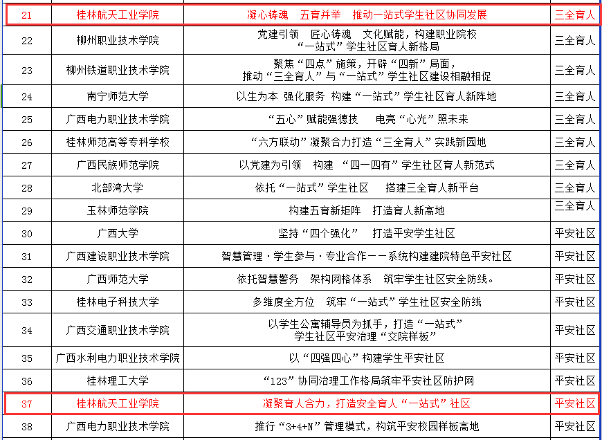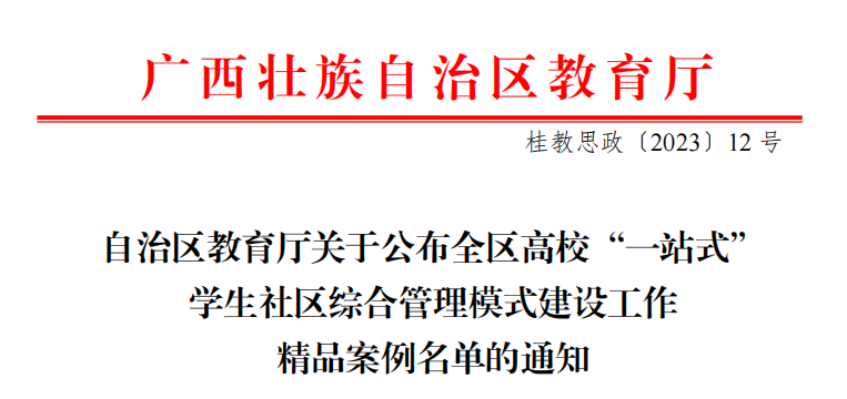 近日,自治区教育厅公布全区高校“一站式”学生社区综合管理模式建设工作精品案例名单,我校《党建引领沉下去 育人实绩提起来》《凝心铸魂 五育并举 推动一站式学生社区协同发展》《凝聚育人合力 打造安全育人“一站式”社区》3个案例成功入选。