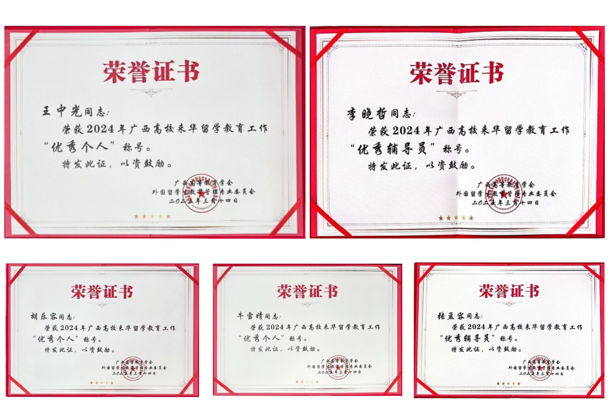 2025年3月14日,由广西留管学会组织的“广西高教会外国留学生教育管理专业委员会2024年年会暨表彰大会”在桂林理工大学隆重举行,我校王中光等三名教师荣获“广西来华留学教育优秀个人”,李晓哲等两名教师获“广西来华留学教育优秀辅导员”荣誉称号。