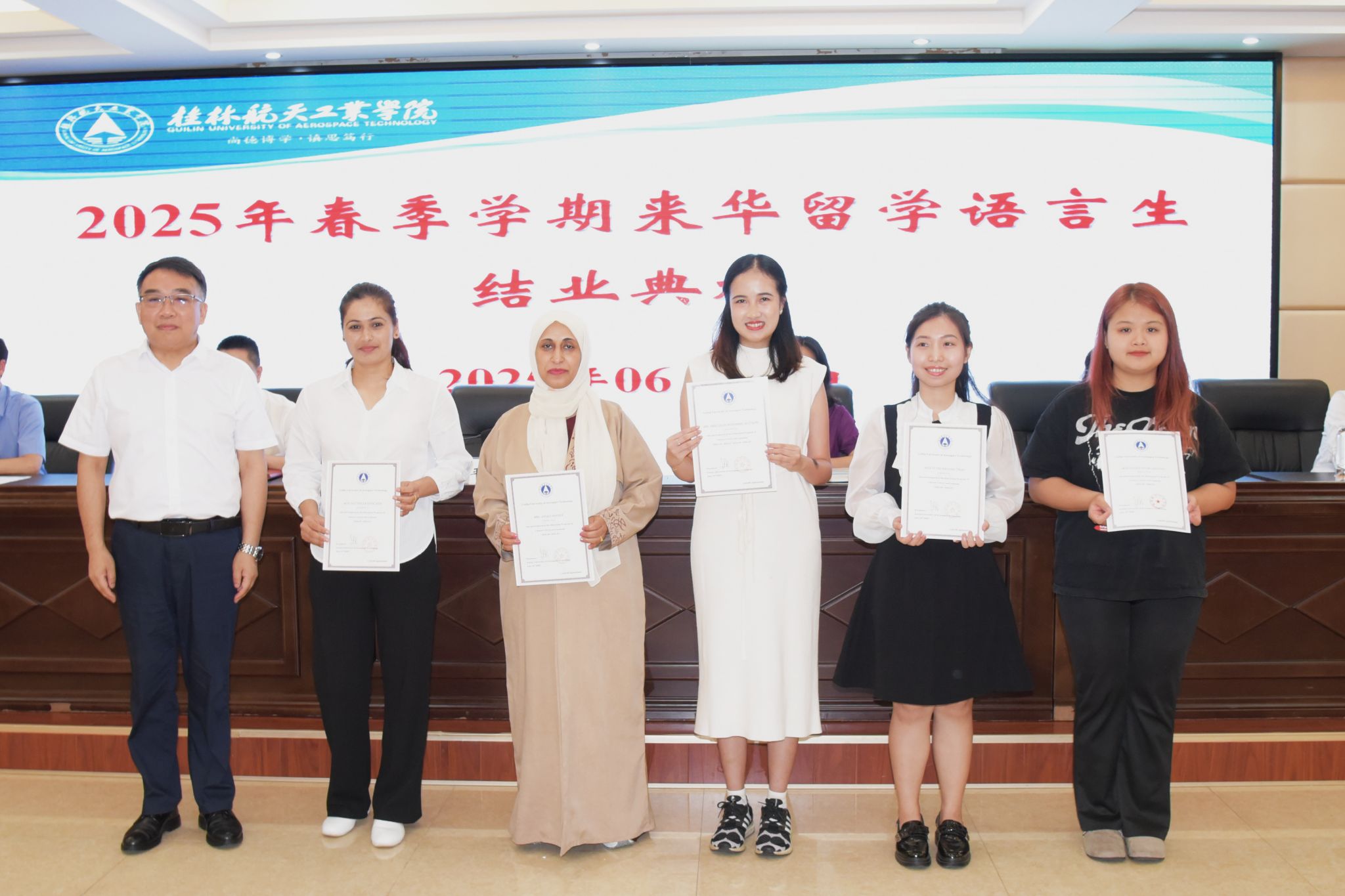典礼上,张烈平向圆满完成学业的来华留学生们致以最热烈的祝贺,并高度赞扬了他们在语言学习中克服困难、努力进取的精神,也感谢他们为校园带来了多元文化活力。同时,他还向结业留学生提出了三点殷切希望:他希望留学生们能够成为友谊的使者,搭建中外文化交流的桥梁;希望他们能够永葆求知的热情,在知识的海洋继续耕耘;希望他们常回“家”看看,勿忘母校,桂航永远欢迎大家。随后,我校教师代表及结业学生代表也分别作了发言。典礼最后,与会领导依次为结业学生颁发了结业证书,并与他们亲切合影留念。
