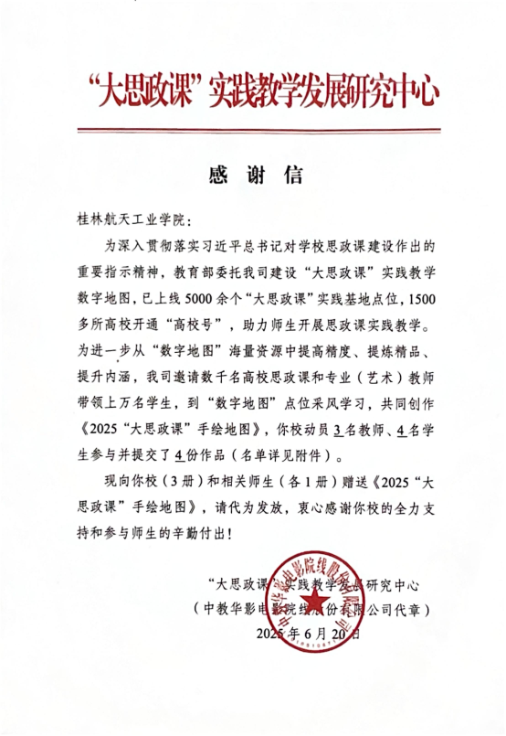 近日,由乐竞官网师生联合“红军长征湘江战役纪念馆”共同完成的作品《追寻红色记忆 共促民族团结——湘江战役90年桂北大地谱新篇》成功入选教育部《2025“大思政课”手绘地图》。“大思政课”实践教学发展研究中心向我校发来感谢信,对学校在《2025“大思政课”手绘地图》项目中的积极参与和组织工作表示诚挚感谢。
