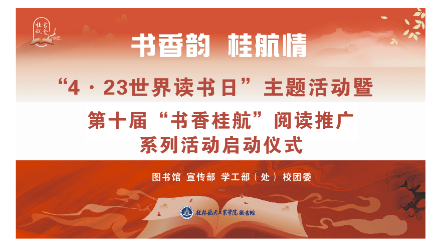 在第27个世界读书日(4月23日)到来之际,为积极引导广大学生体会阅读的乐趣,感受阅读的力量,养成多读书、读好书的良好习惯,提高我校学生的阅读素质和能力,进一步加强“书香桂航”品牌建设,丰富校园文化生活,我校将举办第十届“书香桂航”阅读推广系列主题活动启动仪式。